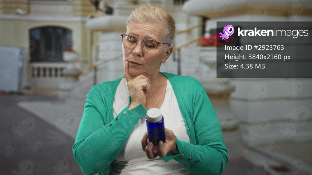 Woman wearing green cardigan and glasses holding blue pill bottle with finger on chin in front of building entrance; uncertainty.