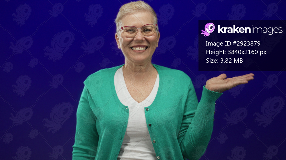 Woman wearing green cardigan and glasses smiling with palm up right hand in blue studio; warm friendly happiness.