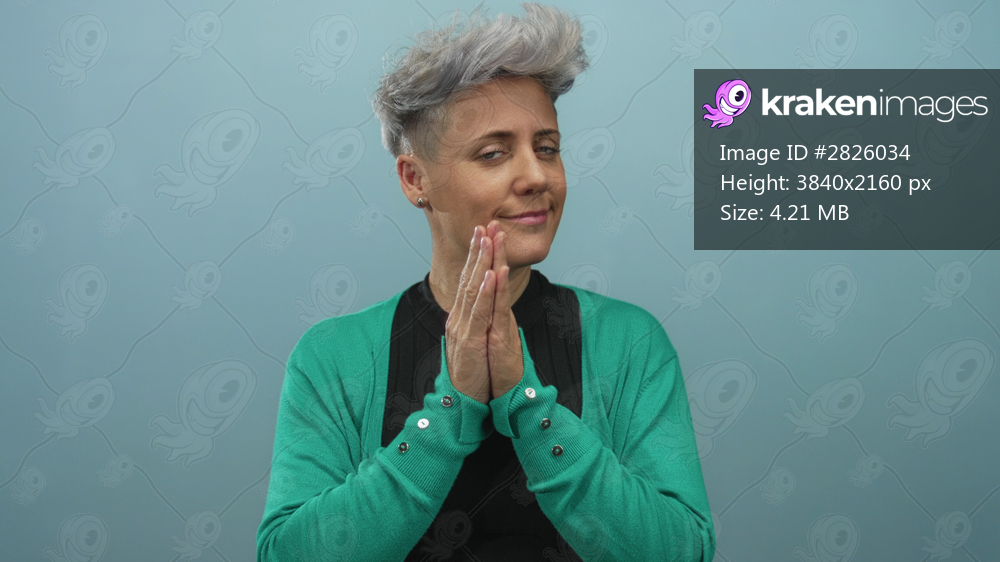 Woman wearing green cardigan with hands clasped gesture in studio against blue background; gratitude inspiration.