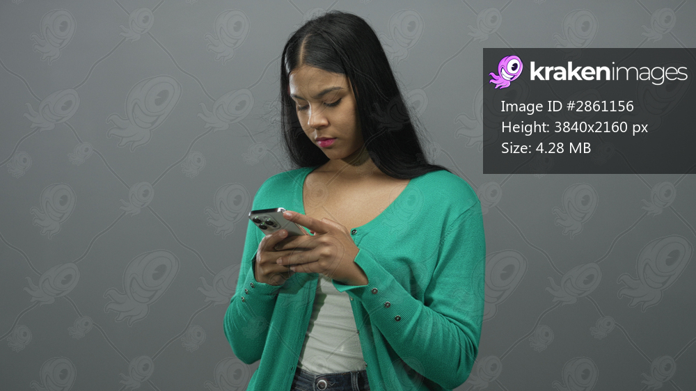 Woman wearing green cardigan holding smartphone texting in studio against gray backdrop; concentration.