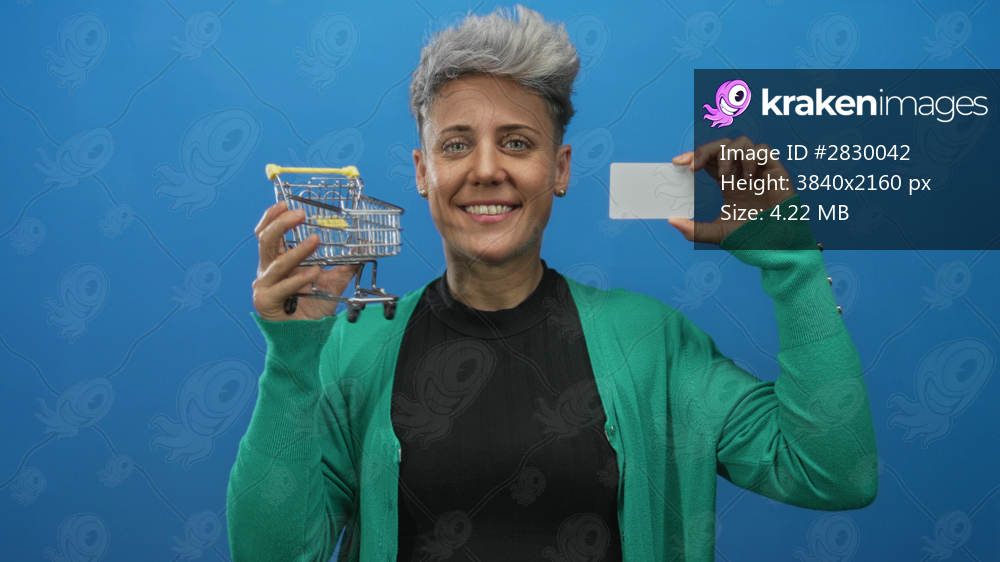 Woman wearing green cardigan holds miniature shopping cart and credit card in studio; financial literacy confidence.