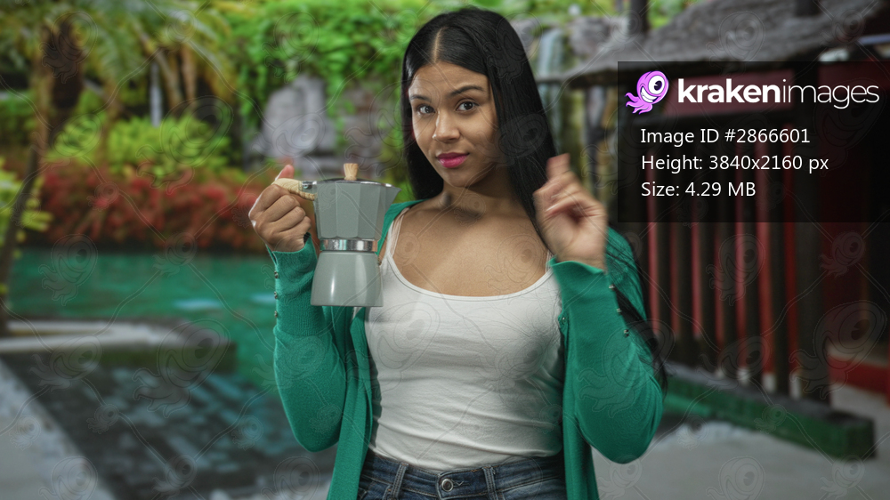 Woman wearing green cardigan and white tank top holding coffee maker and pointing finger at it in building; concentration ritual simplicity.