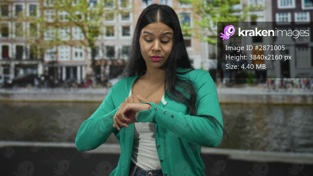 Woman wearing green cardigan and white tank top points finger to wrist on city street amidst canal houses; urgency.