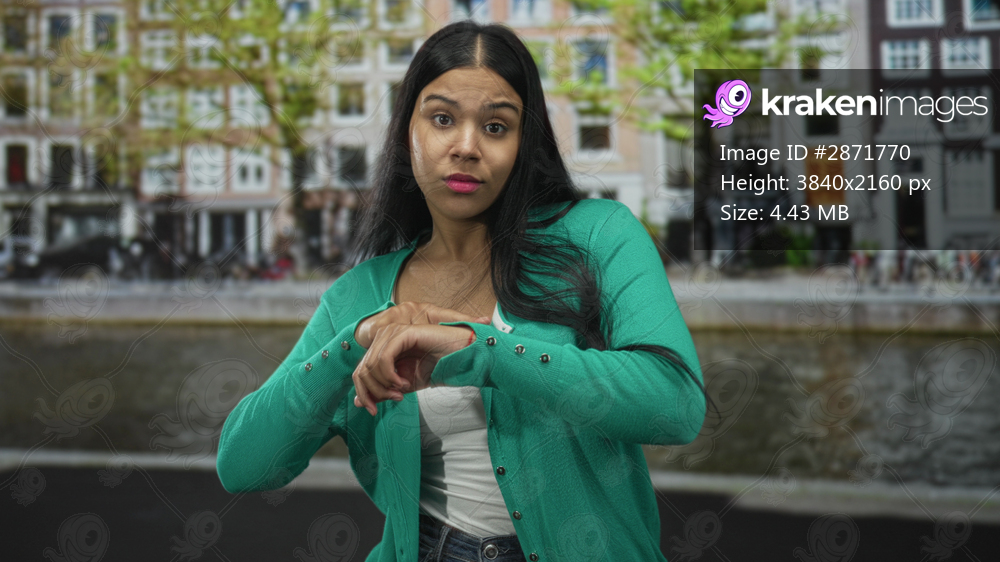 Woman wearing green cardigan and white tank top points finger to wrist on city street amidst canal houses; urgency.