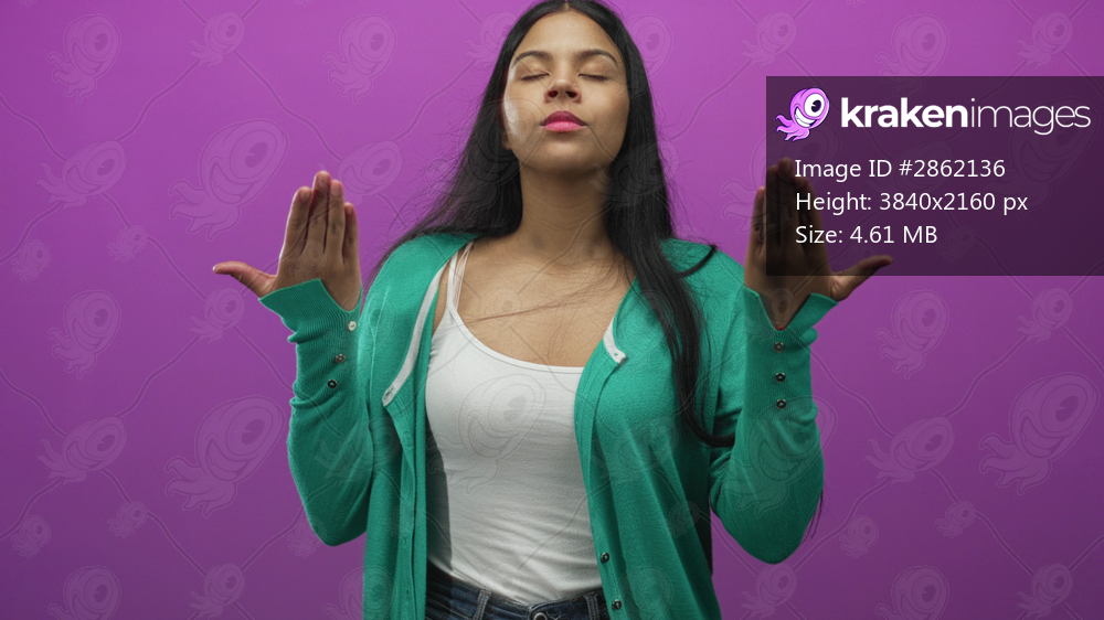 Woman wearing green cardigan and white tank top with raised bare hands and closed eyes in purple studio; serenity peace.