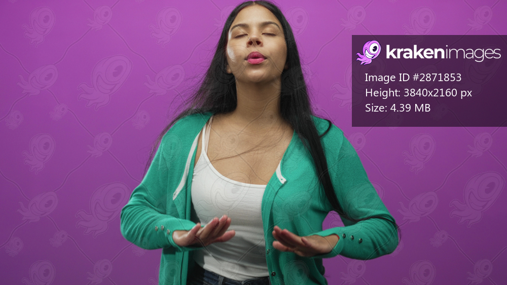 Woman wearing green cardigan and white tank top with raised bare hands and closed eyes in purple studio; serenity peace.