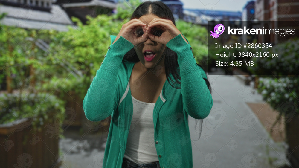 Woman wearing green cardigan and white tank top shapes hands into binoculars on street; curiosity watching exploring.