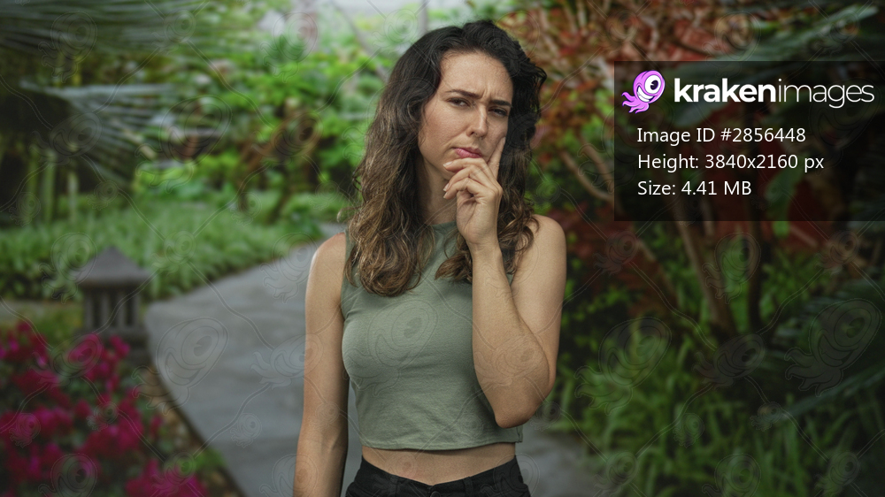Woman wearing green crop top points finger to viewer in forest path lined with foliage and blossoms; determination.