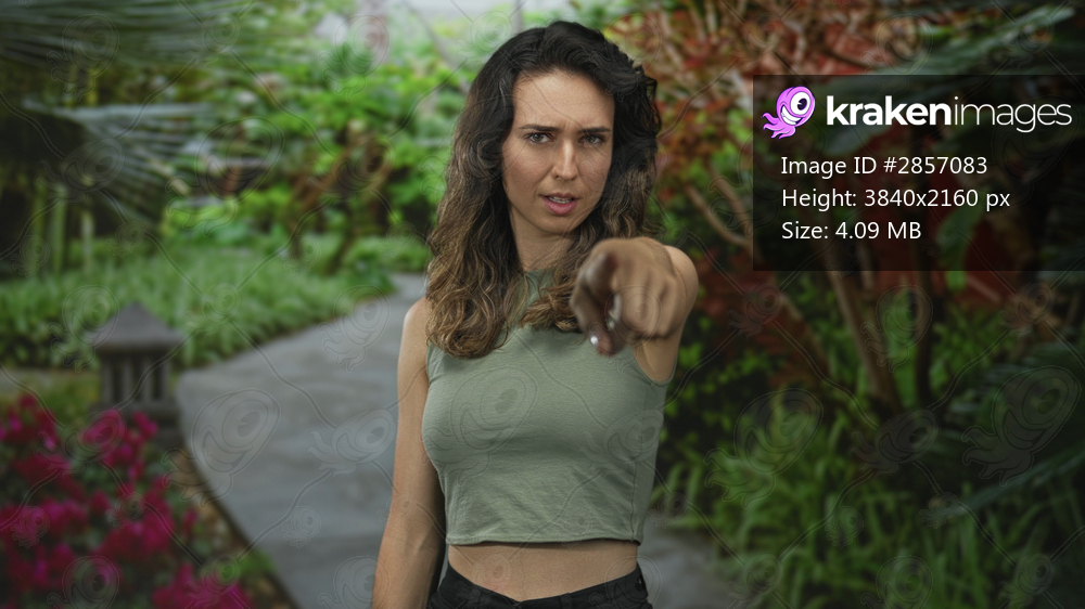 Woman wearing green crop top points finger to viewer in forest path lined with foliage and blossoms; determination.