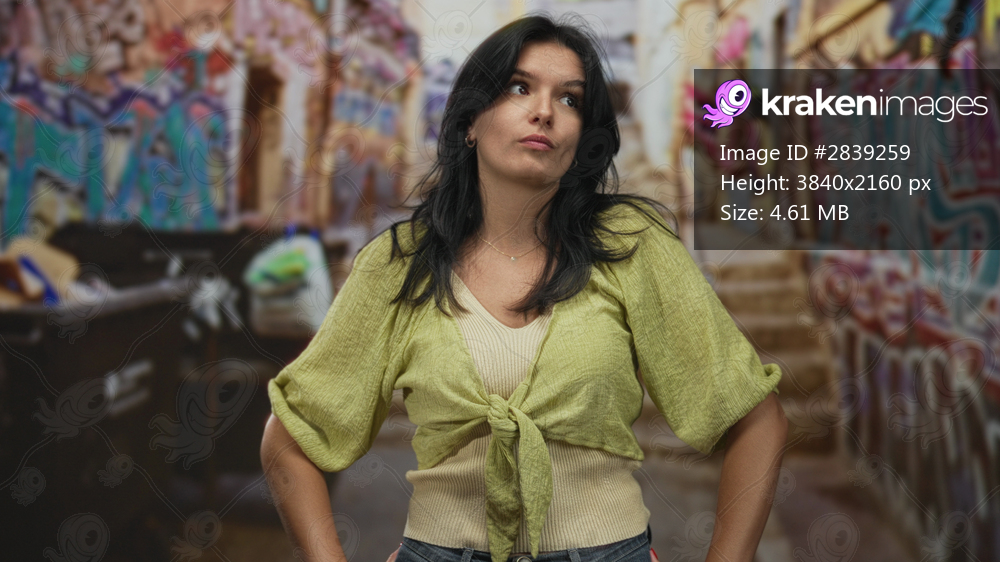 Woman wearing green knotted shirt standing with hands on hips in graffiti covered street; bold confidence optimism joy.