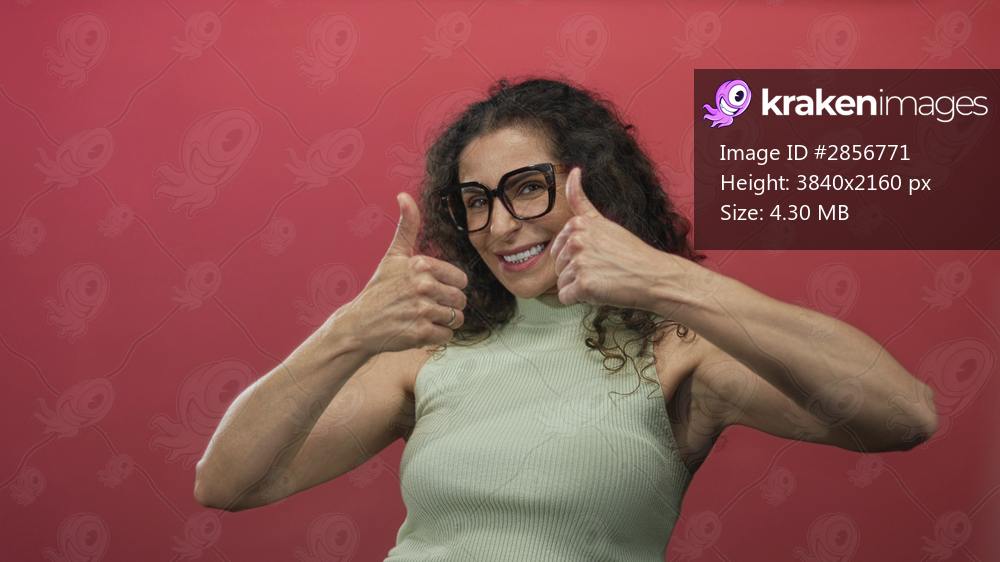 Woman wearing green ribbed tank top and oversized glasses giving enthusiastic thumbs up gesture in bright red studio; confidence success.