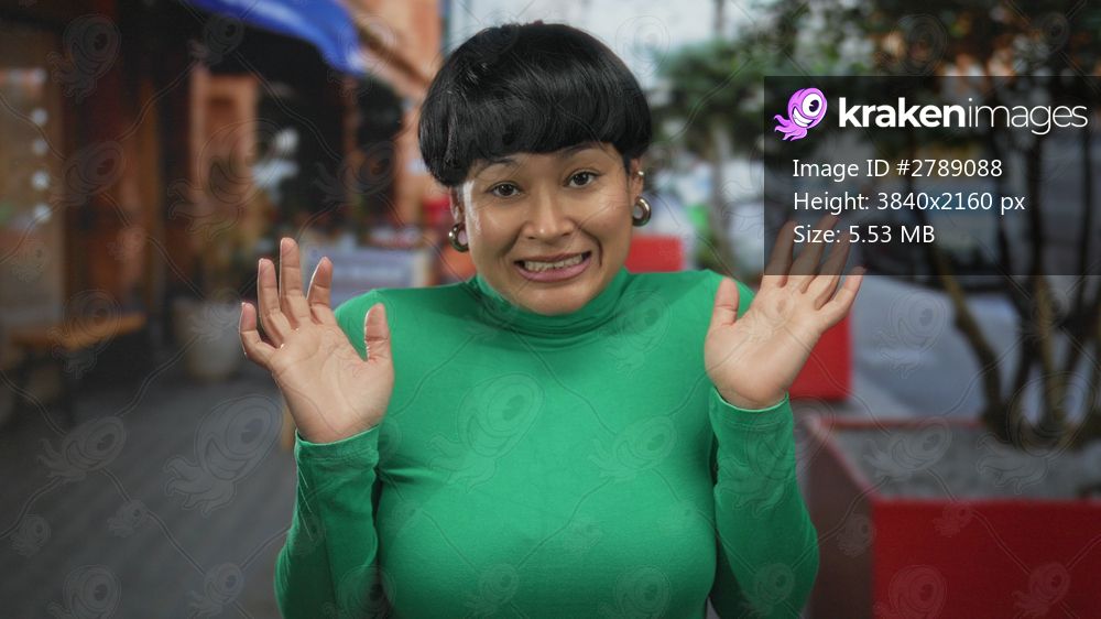 Woman wearing green shirt expresses playful surprise on city street near trees and cafe, creating humorous outdoor scene in urban environment.