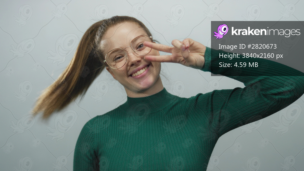 Woman wearing green sweater and glasses shows hand peace sign gesture in studio with light gray background; playfulness.