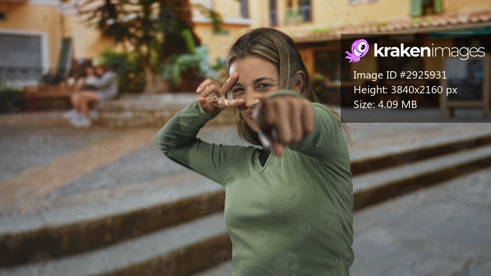 Woman wearing green sweater pointing finger at camera and making peace sign with other hand near eye on street steps; friendly confidence playful.