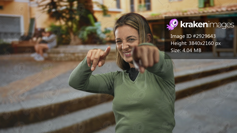 Woman wearing green sweater pointing finger at camera and making peace sign with other hand near eye on street steps; friendly confidence playful.