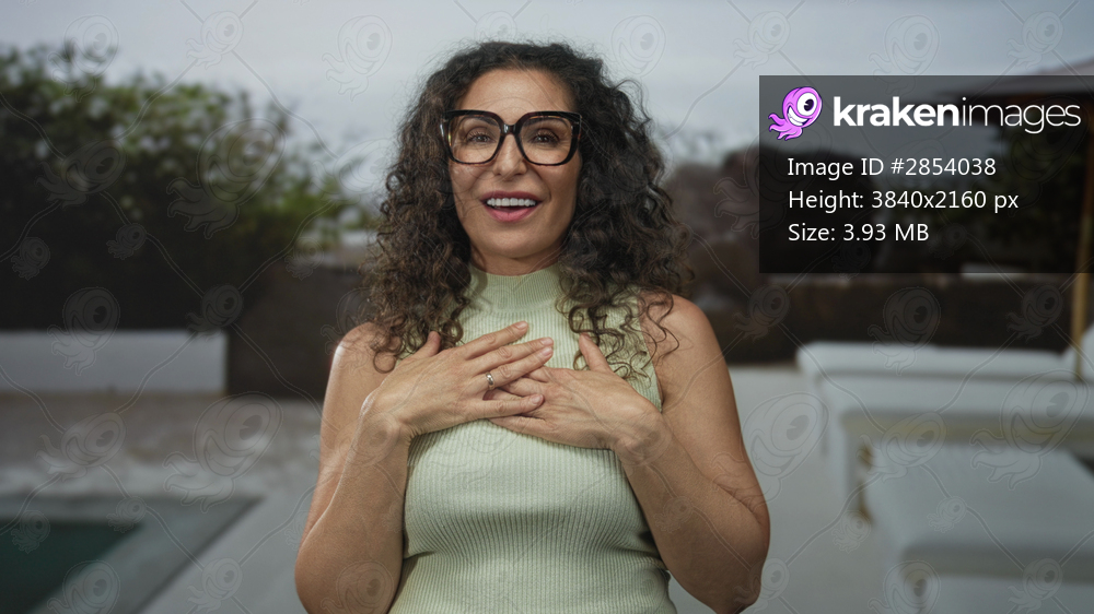 Woman wearing green top and glasses clasps hands to chest on cruise ship deck building; gratitude sincerity warmth connection.
