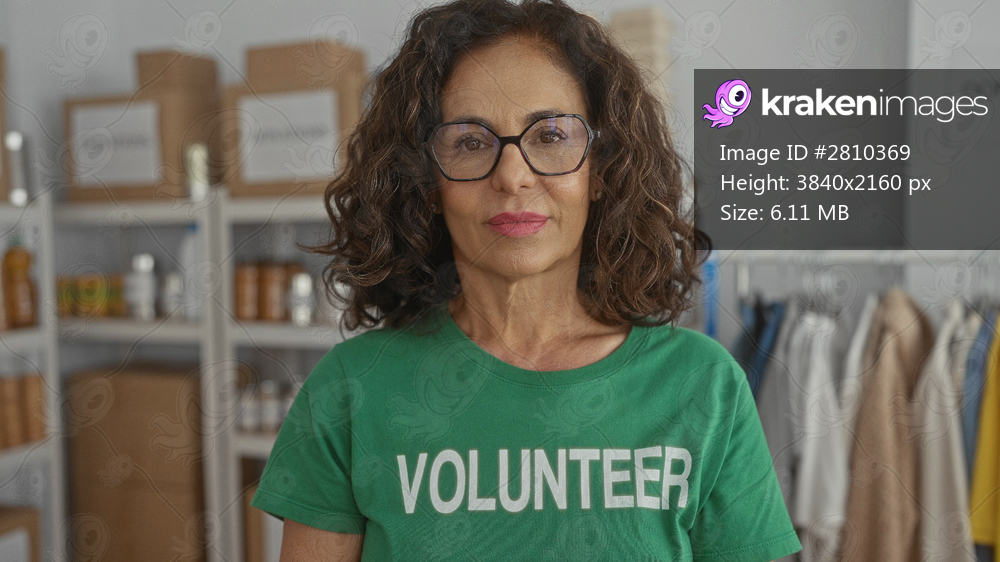 Woman wearing green volunteer shirt making heart shape with hands indoors at charity room with shelves and boxes showcasing community support and compassion. - Kraken Images