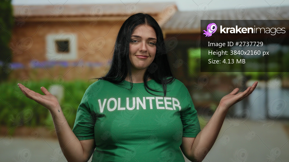 Woman wearing green volunteer shirt standing outside in a city street with a curvy figure exudes confidence and dedication to community service in an urban setting. - Kraken Images