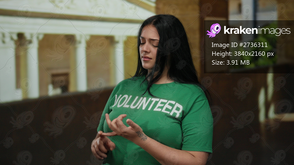 Woman wearing green volunteer shirt stands inside historic university building.