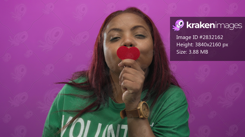 Woman wearing green volunteer t-shirt holds heart shape to eye while puckering lips in studio; joyful.