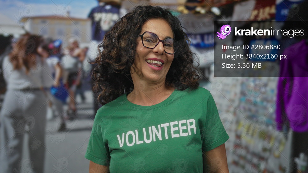 Woman wearing green volunteer uniform at busy outdoor market sticking tongue out; playfulness friendliness joy community.