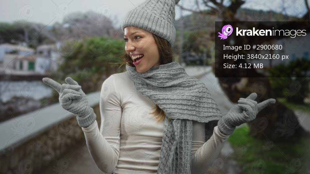 Woman wearing grey knit hat, matching scarf and gloves points both fingers outward on a seaside street, laughing with open mouth and visible teeth; joyful. - Kraken Images