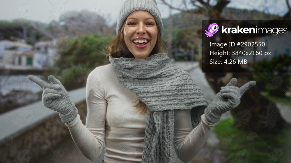 Woman wearing grey knit hat, matching scarf and gloves points both fingers outward on a seaside street, laughing with open mouth and visible teeth; joyful. - Kraken Images