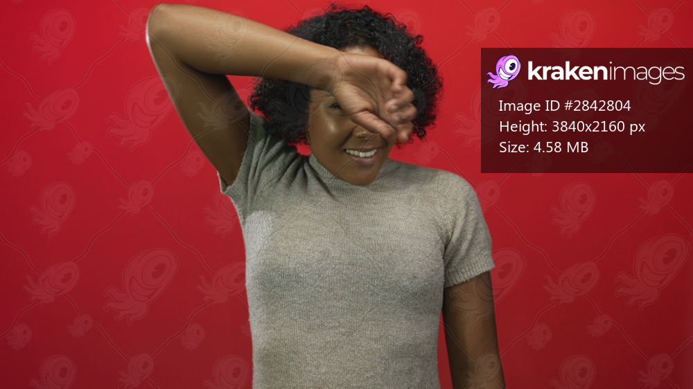 Woman wearing grey sweater wiping sweat from forehead with arm in studio setting against red backdrop; relief.