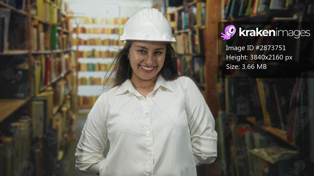 Woman wearing hardhat smiling with hands behind back in building library aisle; confidence knowledge professionalism.