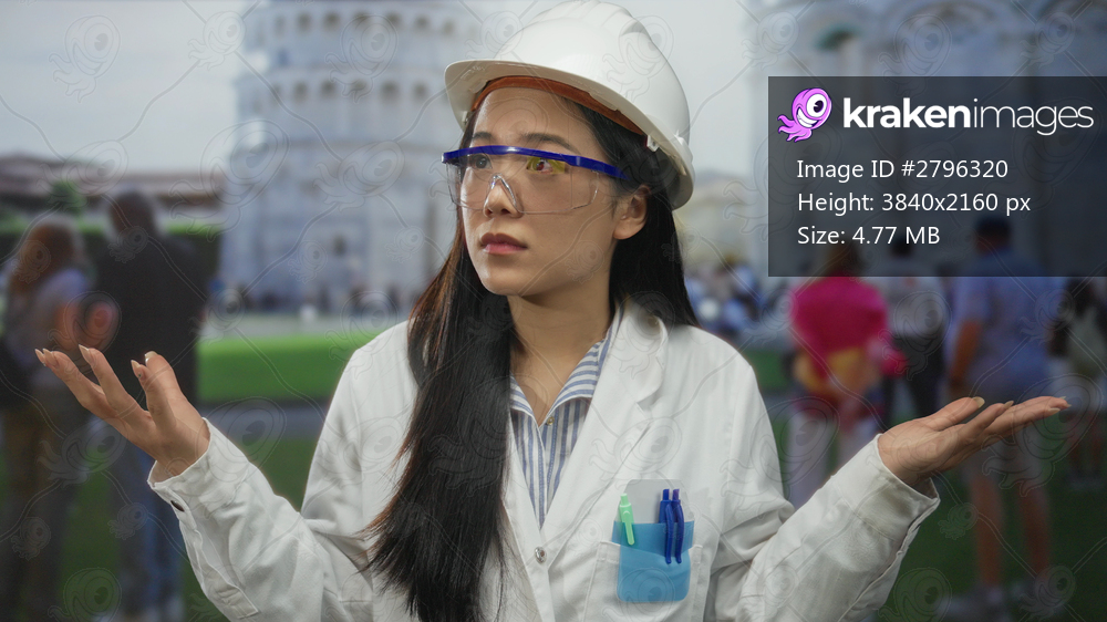 Woman wearing hardhat stands outdoors near pisa tower, showcasing confusion while tourists gather around.