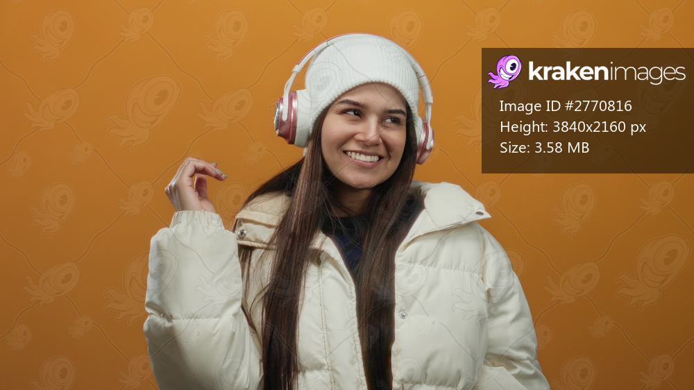 Woman wearing headphones and a white jacket smiles against an orange background, combining playful and stylish elements in an isolated studio shot.