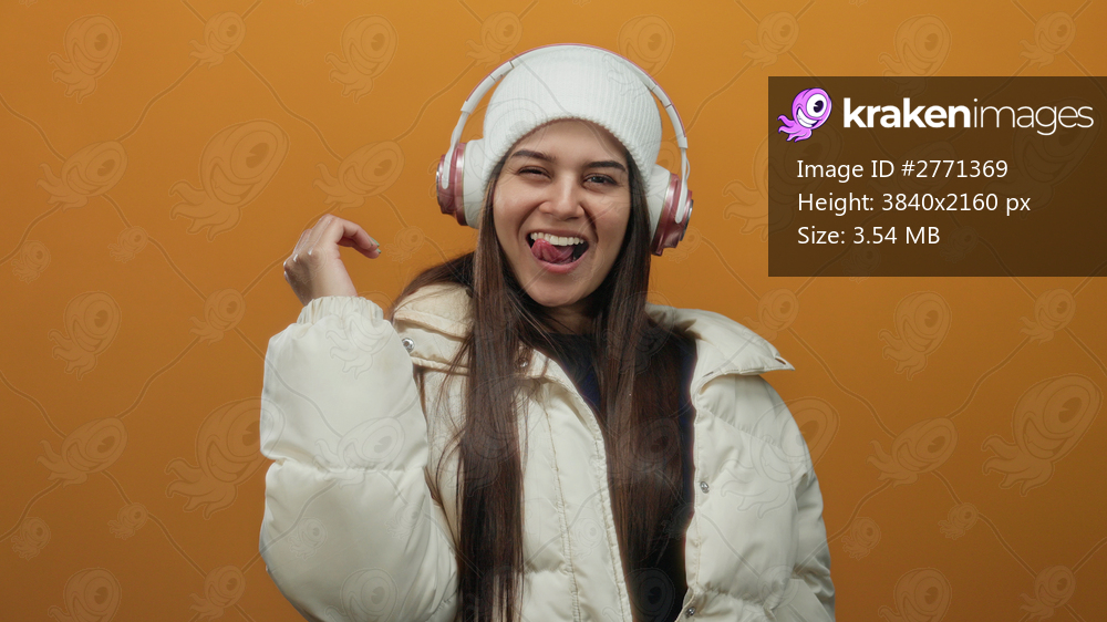 Woman wearing headphones and a white jacket smiles against an orange background, combining playful and stylish elements in an isolated studio shot.