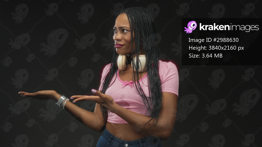 Woman wearing headphones around neck and a pink crop shirt with jeans, braided hair visible, gesturing with palm up and pointing finger in studio; playful confidence. - Kraken Images