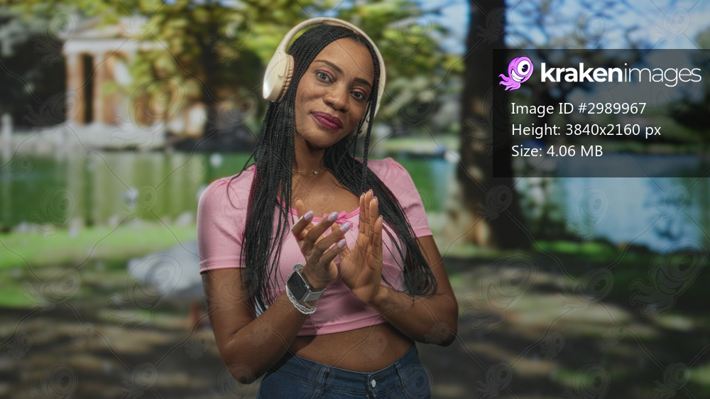 Woman wearing headphones clapping hands near a classical building by a sunlit pond in a park; music calm serenity.