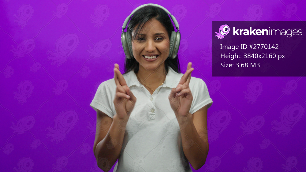 Woman wearing headphones with fingers crossed over a vibrant purple background, expressing hope and positivity in a casual white shirt with a cheerful demeanor. - Kraken Images