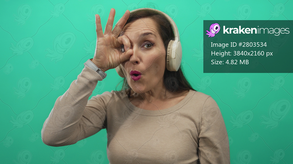 Woman wearing headphones gestures okay sign with hand in front of green background expressing positivity and confidence in a playful isolated studio environment. - Kraken Images