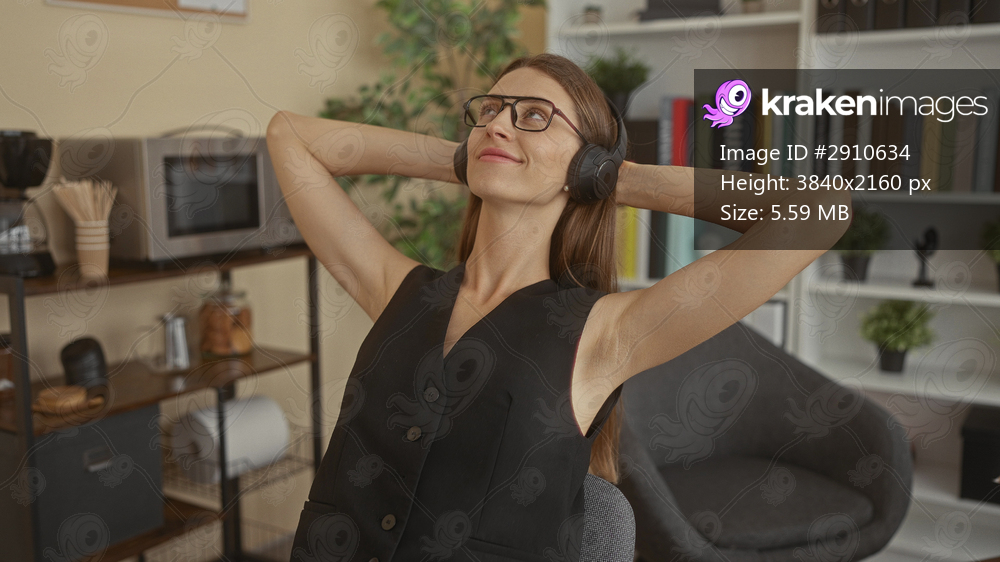 Woman wearing headphones and glasses with arms behind head in building, seated at chair; relaxation break.