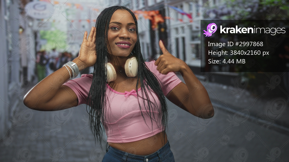 Woman wearing headphones with hand cupped to ear and right hand forming ok sign while smiling on a cobblestone street; carefree.