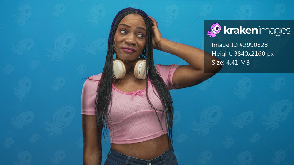 Woman wearing headphones, hand to head and exposed midriff in pink crop top in studio; uncertain shrug.