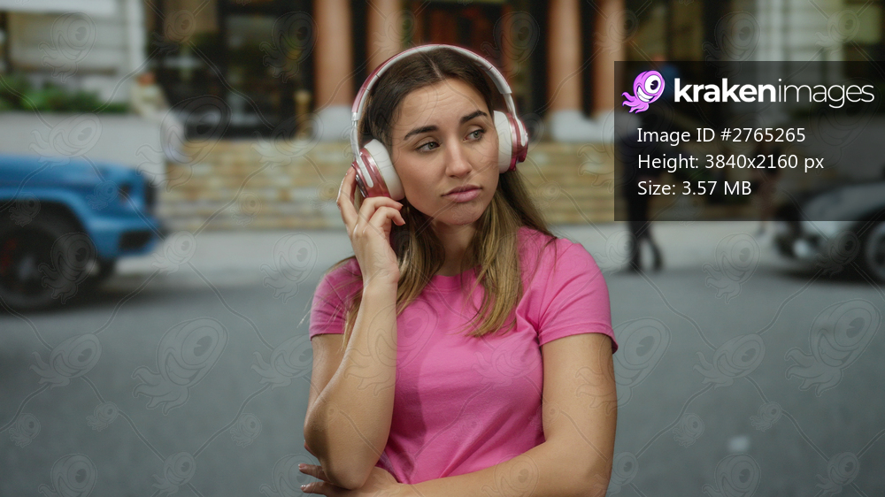 Woman wearing headphones in pink shirt standing on an outdoor street looking thoughtful while listening to music with cars and buildings in background. - Kraken Images