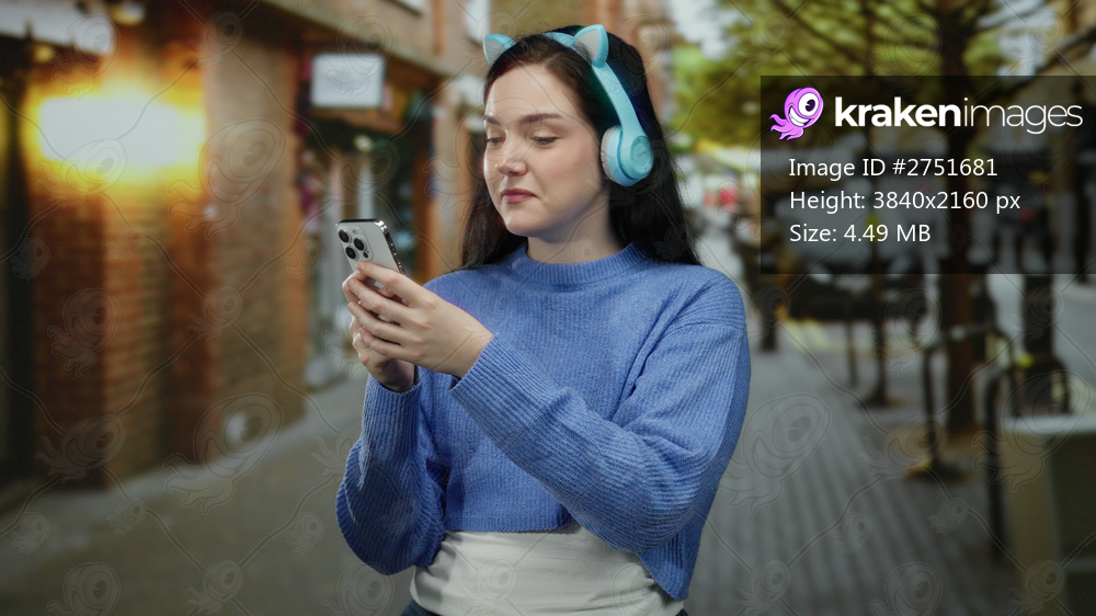Woman wearing headphones looking at smartphone on city street featuring casual style, brunette hair, and a modern urban setting with shops in the background. - Kraken Images