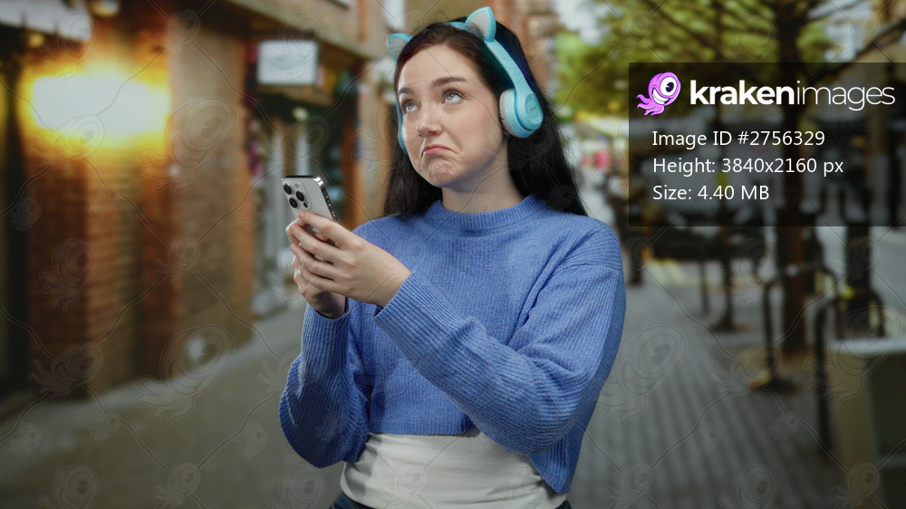 Woman wearing headphones looking at smartphone on city street featuring casual style, brunette hair, and a modern urban setting with shops in the background. - Kraken Images