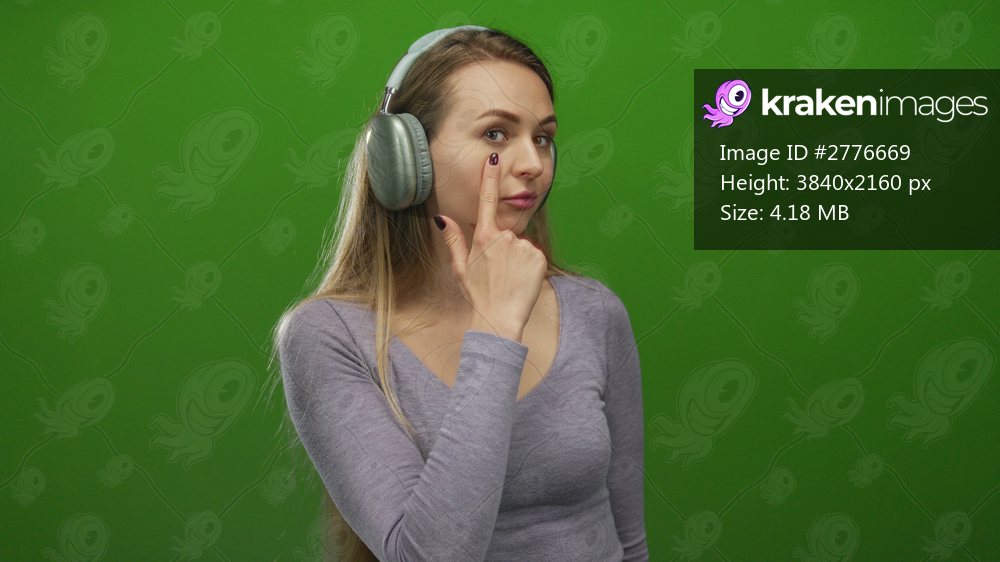 Woman wearing headphones makes a watchful gesture pointing to her eye, standing against a vibrant green background, conveying alertness and concentration. - Kraken Images