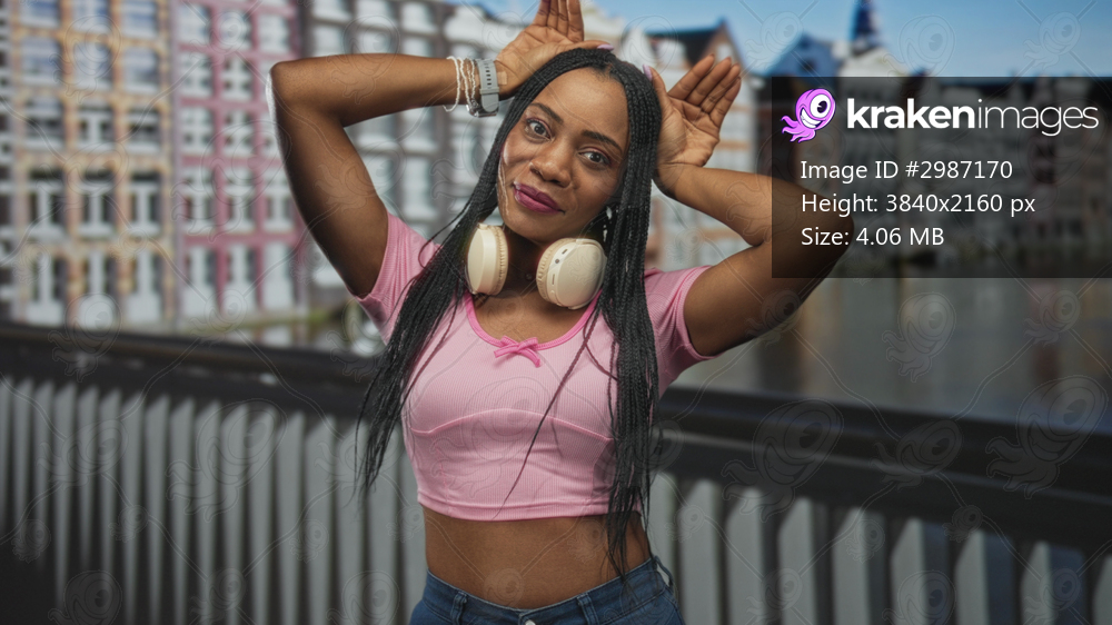 Woman wearing headphones and pink crop top, hands held above head on a building railing by canal; youthful joy.