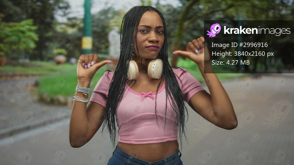 Woman wearing headphones pointing thumbs to chest on street, pink crop shirt and bracelets; confidence empowerment.