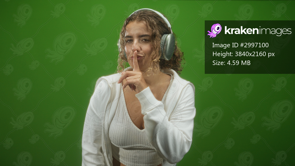 Woman wearing headphones presses finger to lips in studio, white hoodie and ribbed tanktop, direct gaze and shush gesture; secrecy.