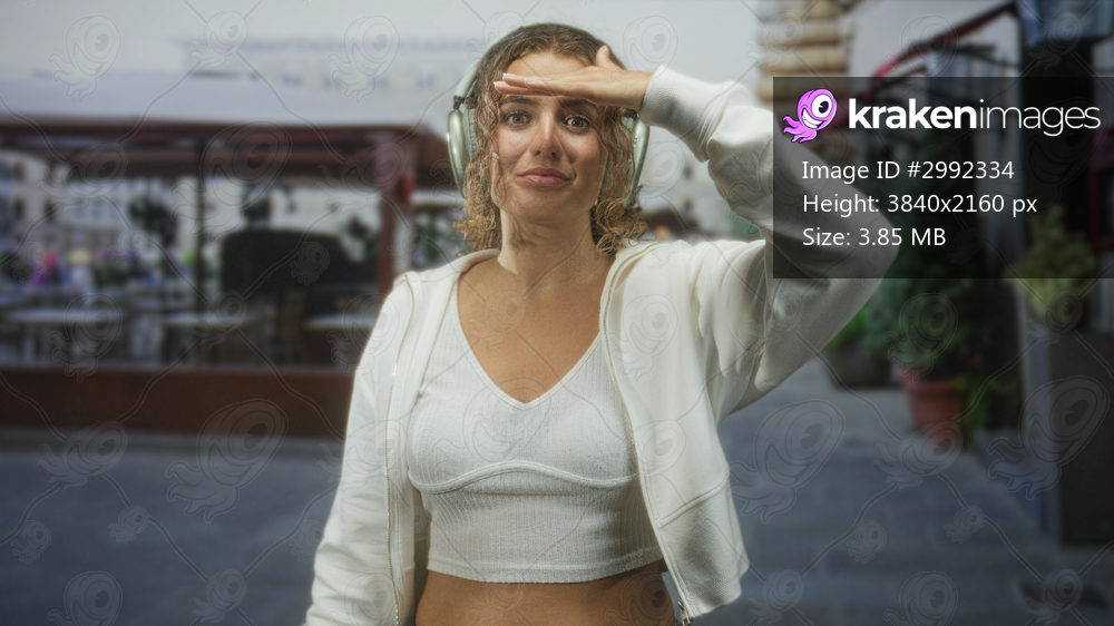 Woman wearing headphones shading her eyes with hand on a street cafe terrace, cropped tanktop and hoodie visible; curiosity exploration travel.