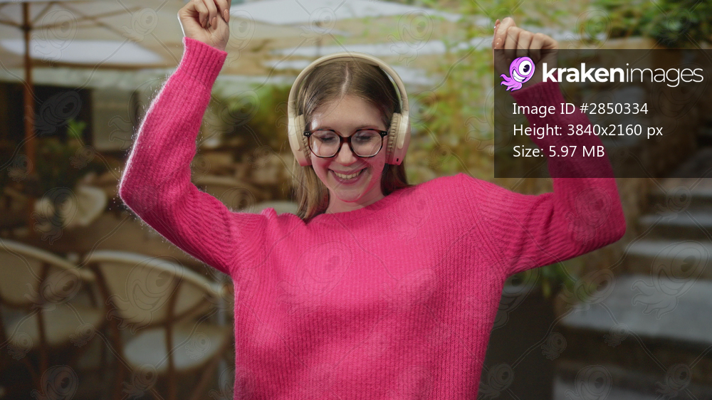 Woman wearing headphones smiles and sways with raised hands on restaurant terrace; joyful freedom peace.
