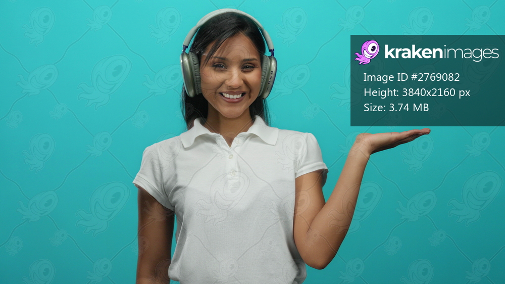 Woman wearing headphones smiles while pointing to her palm against a vibrant green background, suggesting a presentation or product placement.