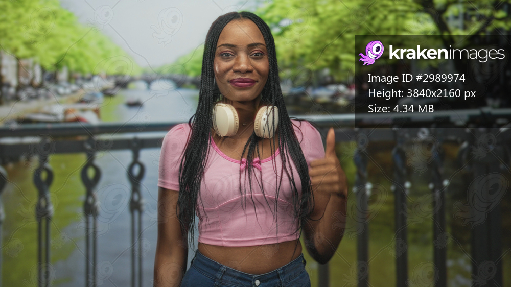 Woman wearing headphones smiling and gesturing on a street bridge by a canal, pink crop top and jeans; confidence ease.